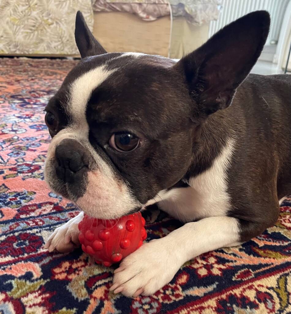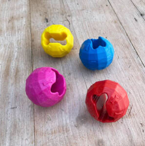 ENG. Ball made of resistant rubber. Bounces, floats. Has a bone-shaped slot where you can put some kibble